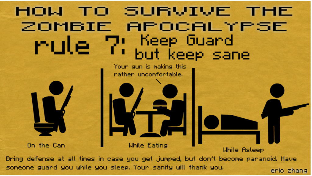 Apparently having a massive amount of rules to survive by does not keep you from dying during the apocalypse, especially when common sense seems to allude you. You could be a rocket scientist but if you have no common sense then I will be seeing you among the masses of zombies.